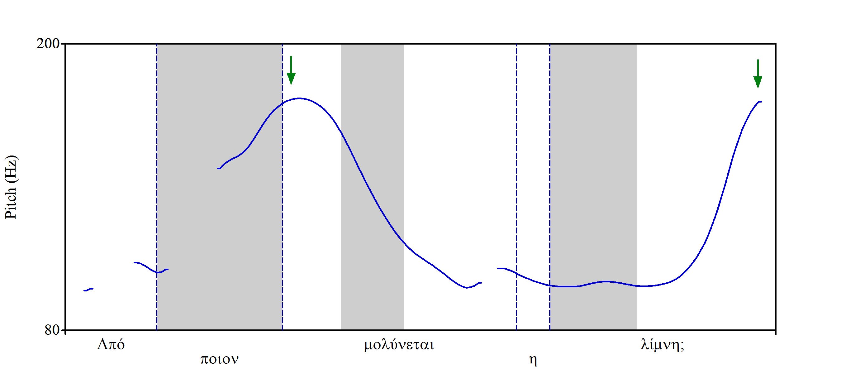 Στις ερωτήσεις μερικής αγνοίας, δηλ. αυτές που περιέχουν ερωτηματική λέξη (ποιος, τι, πού, πότε, κτλ) η φωνή πάει ψηλά στην τονισμένη συλλαβή της ερωτηματικής λέξης, κατεβαίνει μετά χαμηλά και μένει χαμηλά μέχρι την τελευταία τονισμένη συλλαβή της ερώτησης, οπότε και ανεβαίνει πάλι ψηλά για να δηλώσει την ερώτηση.